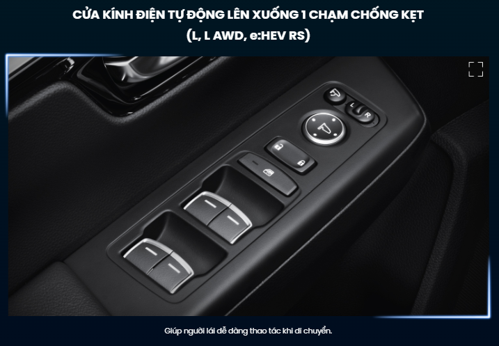 | Cửa kính điện tự động lên xuống 1 chạm chống kẹt | Ghế lái | Tất cả các ghế | Tất cả các ghế | Tất cả các ghế | Tất cả các ghế |