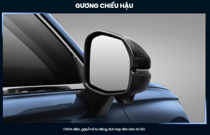 | Gương chiếu hậu | Chỉnh điện, gập/mở tự động tích hợp đèn báo rẽ LED | Chỉnh điện, gập/mở tự động tích hợp đèn báo rẽ LED | Chỉnh điện, gập/mở tự động tích hợp đèn báo rẽ LED | Chỉnh điện, gập/mở tự động tích hợp đèn báo rẽ LED | Chỉnh điện, gập/mở tự động tích hợp đèn báo rẽ LED |